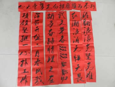 活动中,职工们纷纷拿起毛笔,书写出对生产大丰收的殷切期盼和来年好日子的美好憧憬,值得一提的是,员工李东杨还为公司中层以上领导准备了不同的春联,颇具新意地以领导的姓名作联。不一会儿,一幅幅喜庆的春联就展现在了大家的眼前。整个活动洋溢着新年的喜庆气氛,荡漾着墨汁的扑鼻芳香。据悉,在春节来临之际,这些铺满新春祝福的春联将陆续张贴到全厂车间、生活区。