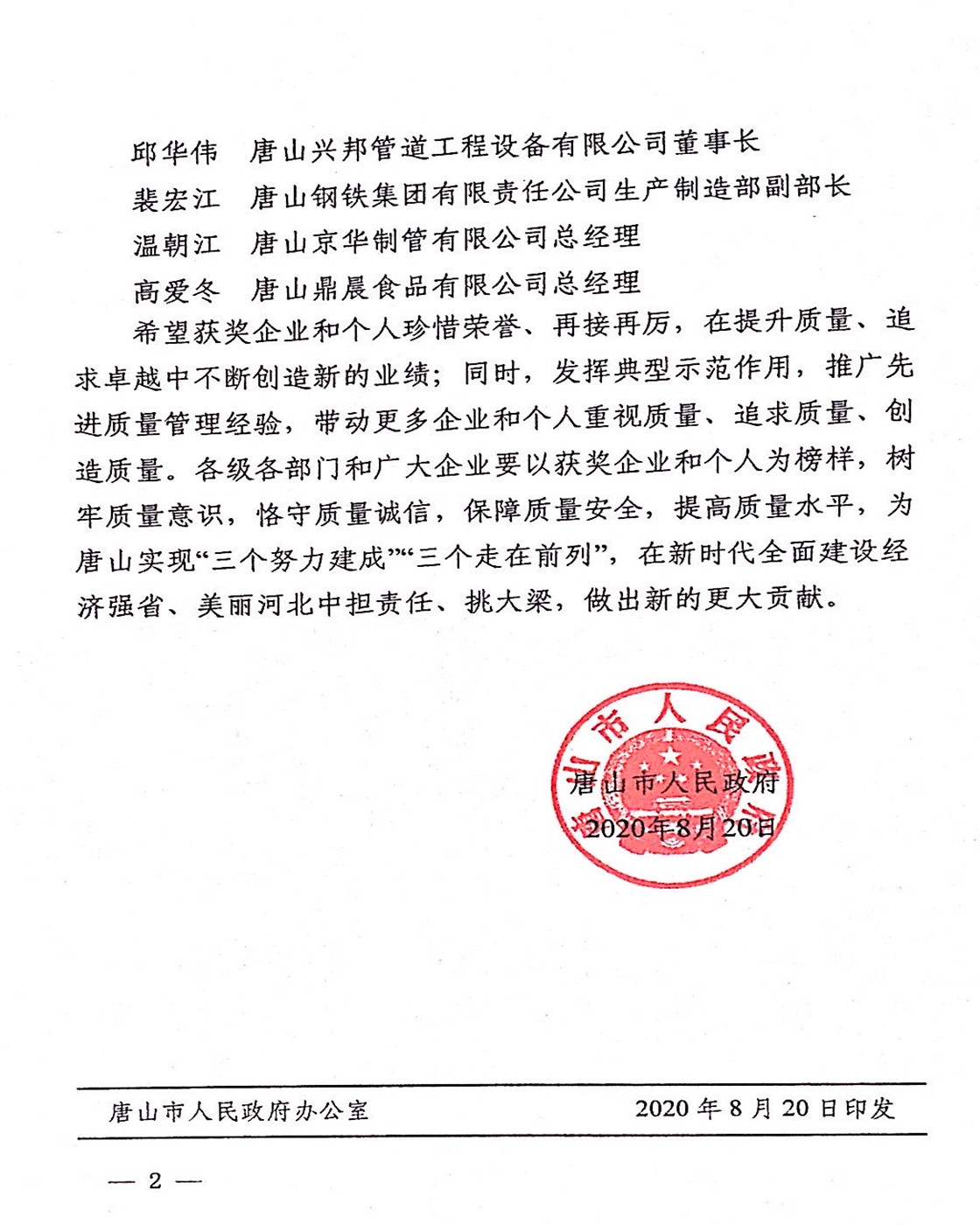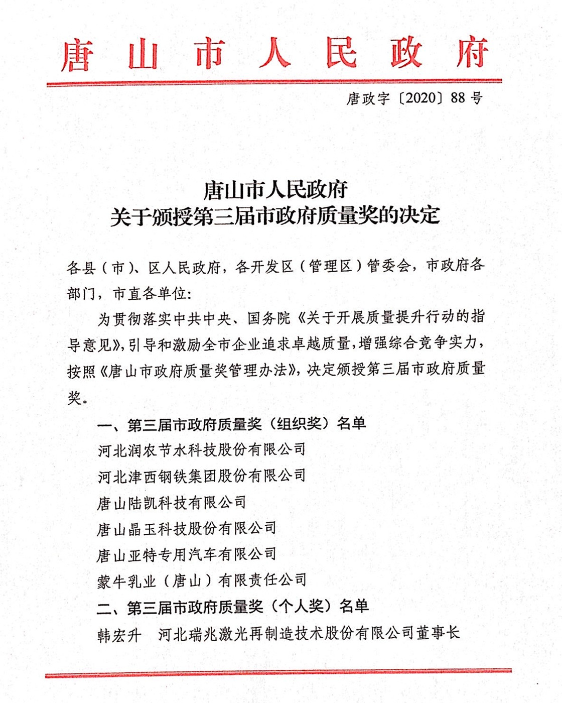近日,公司总经理温朝江荣获第三届“唐山市政府质量奖” (个人奖),该奖项是唐山市质量领域的最高荣誉奖项,由唐山市政府设立,旨在表彰全市在提高质量方面取得卓越成绩的优秀企业及管理人员。